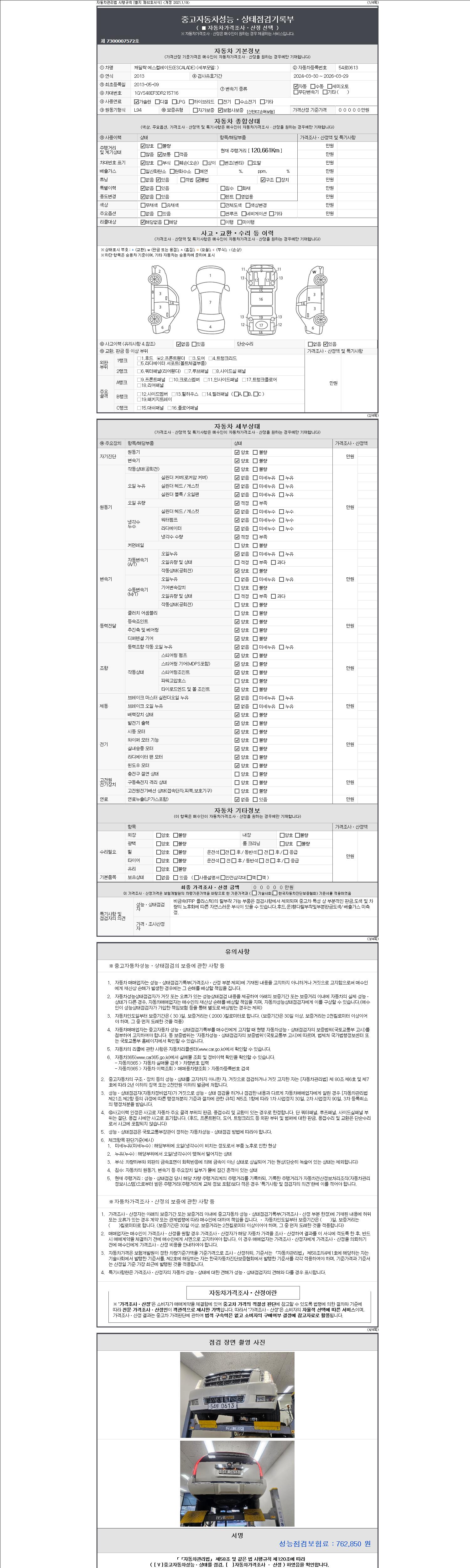 | 주행거리 | 120,119 km | 차량번호 | 54로0613 | 사고유무 | 성능기록부 참조 | 제시번호 | 제 2147483647 호 |
